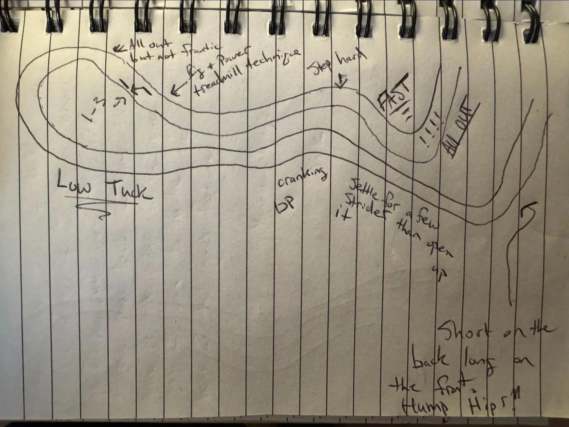 Because there was a distance race on Friday, I did my race prep workout two days before the race. I prefer to do it the day before, but I’m not all that picky. This way I feel a bit more comfortable with pushing harder during the race prep knowing that I have an extra 24 hours before I have to toe the line. This Friday, I took a short jog, watched the races, and drew a little picture of the course with notes on how to ski it well.