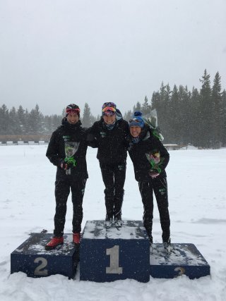 Ben Lustgarten, Liz Guiney, and Kaitlynn MIller filling out the podium in West Yellowstone